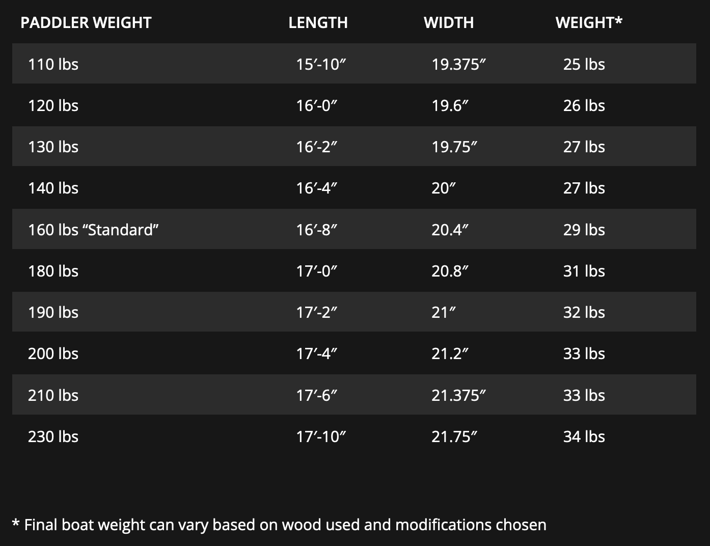 We currently offer the West Greenland in 10 scaled sizes to fit paddlers 110–230 lbs (see sizing chart). Don’t see the size you need? We can make you a custom scaled plan.
