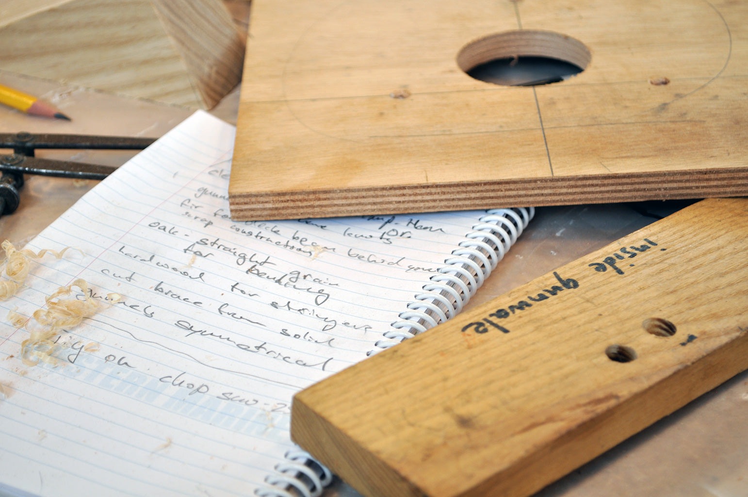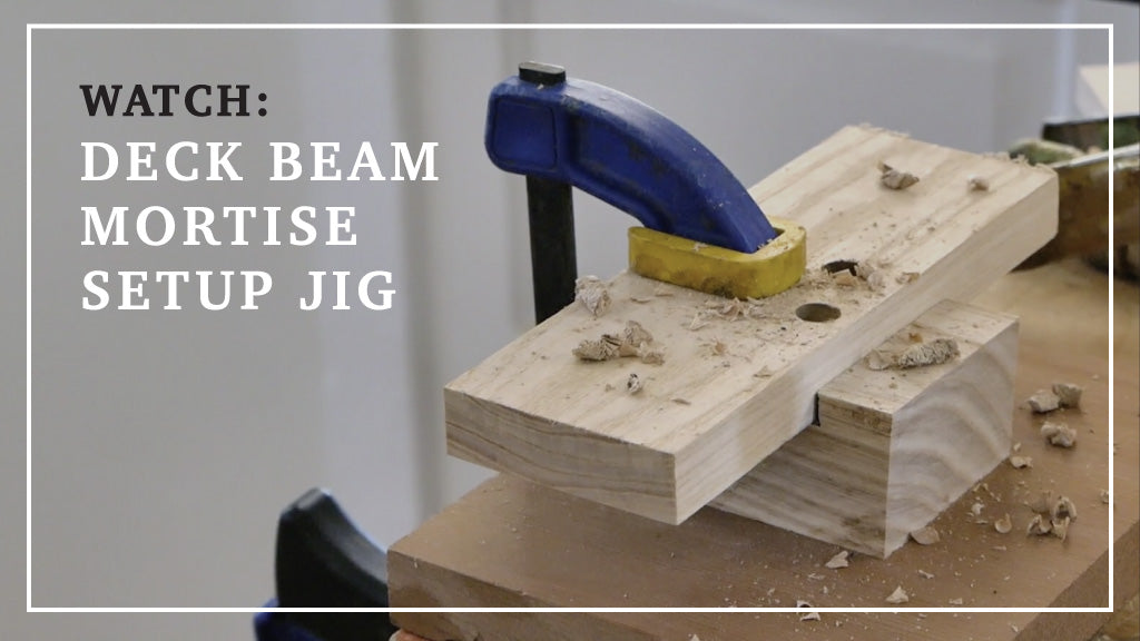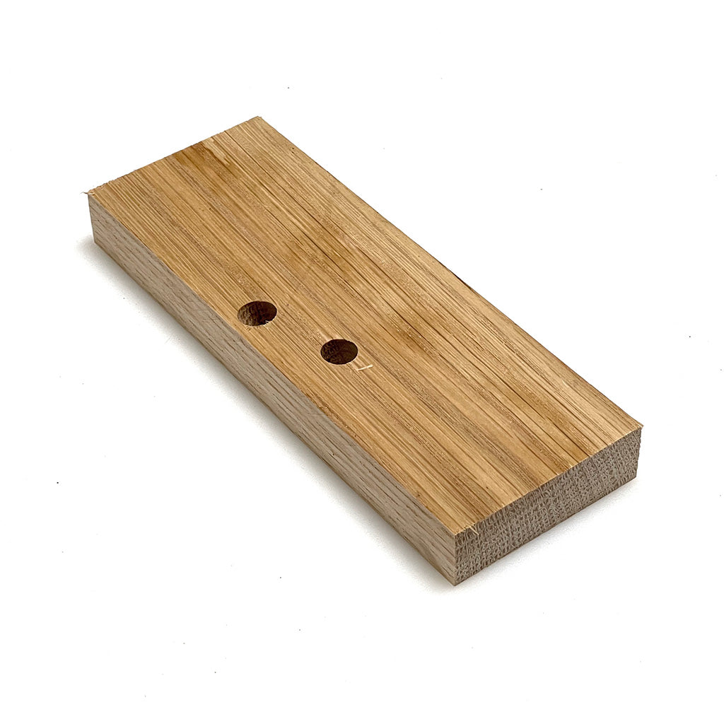 This is a six inch length of hardwood one inch thick and exactly the height of your gunwale with two holes precision cut into the top. You can use these holes to make a simple drill jig or setup a plunge router jig to cut both straight and 25 degree deck beam mortises. This makes a simple, but surprisingly tricky setup task much easier.