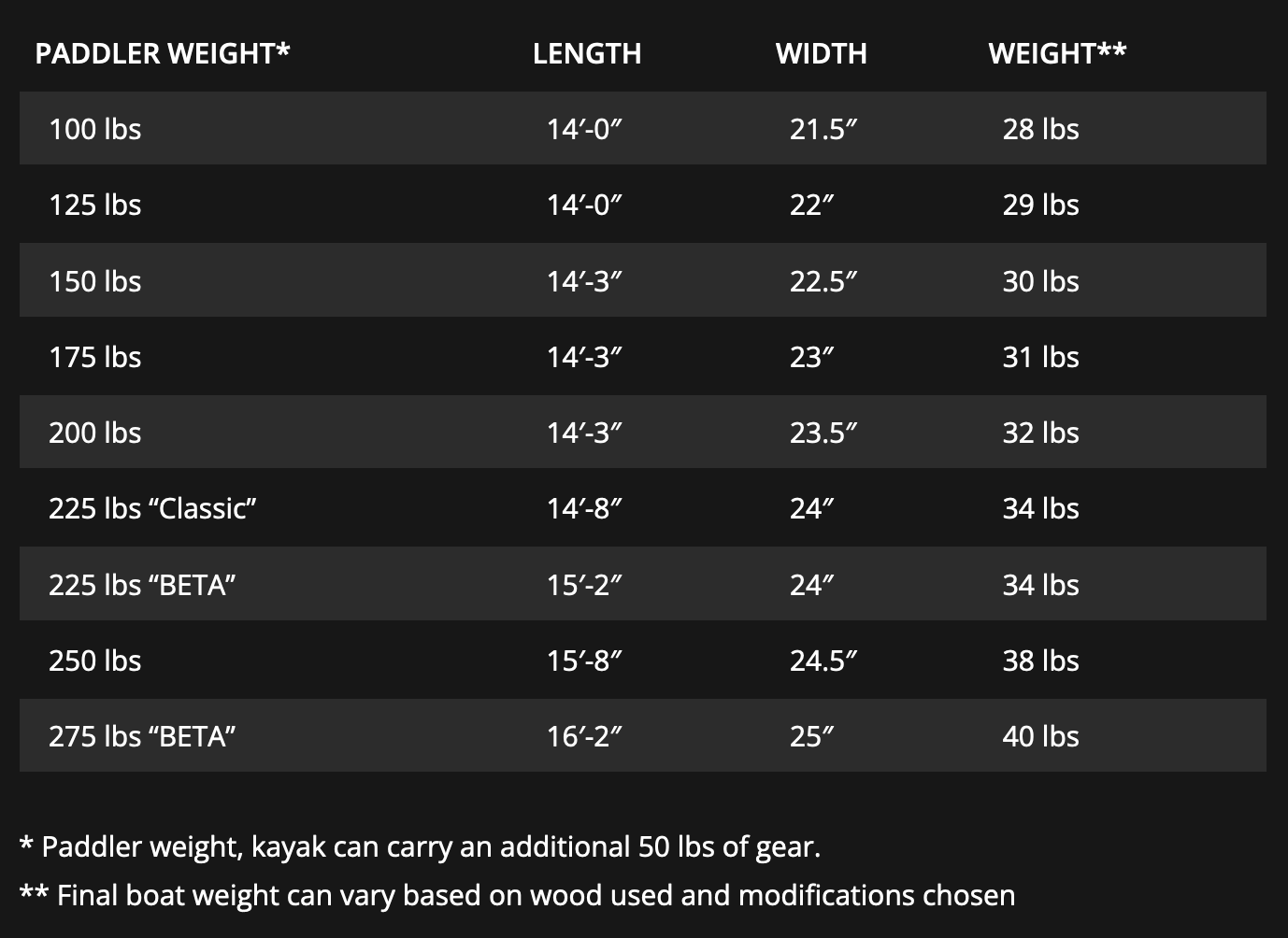The F1 is currently available in 9 sizes (see size chart). The listed weight for each size is the paddler weight, and that kayak can carry up to an additional 50 lbs of gear. If desired, paddlers between sizes can split measurements to create half sizes, but only for the 150, 175, and 200 lb sizes.