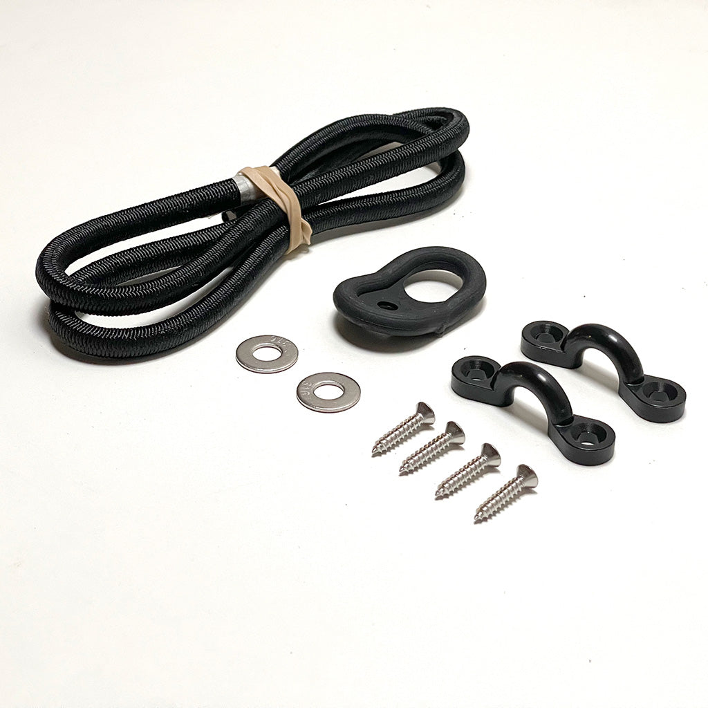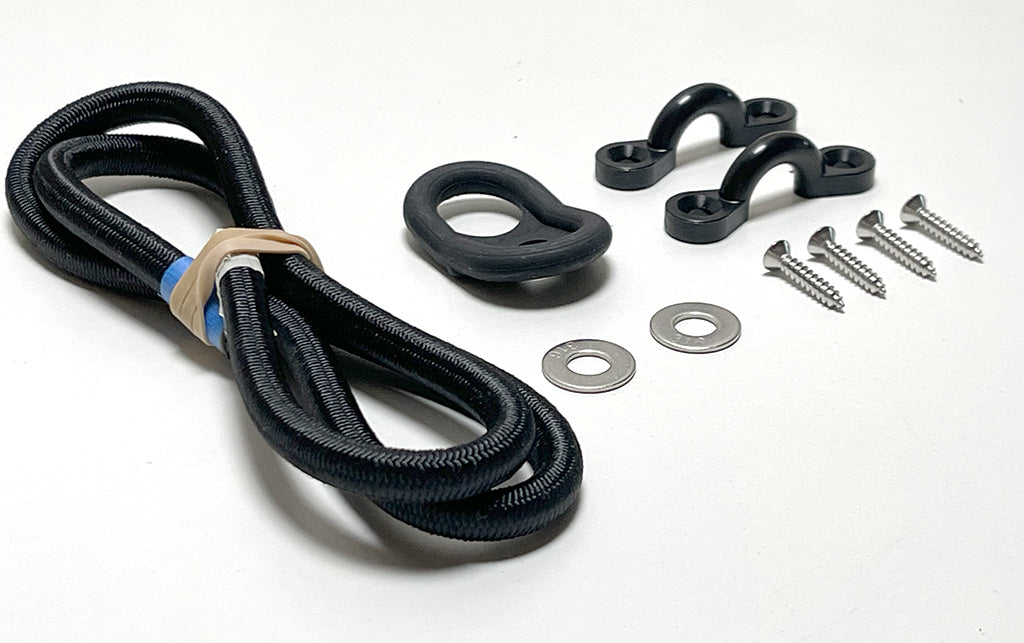 Kit includes plastic hook, two stainless washers to prevent fitting from over-compressing, two plastic pad eyes and mounting hardware, and 30 inches of 5/16" marine bungee.