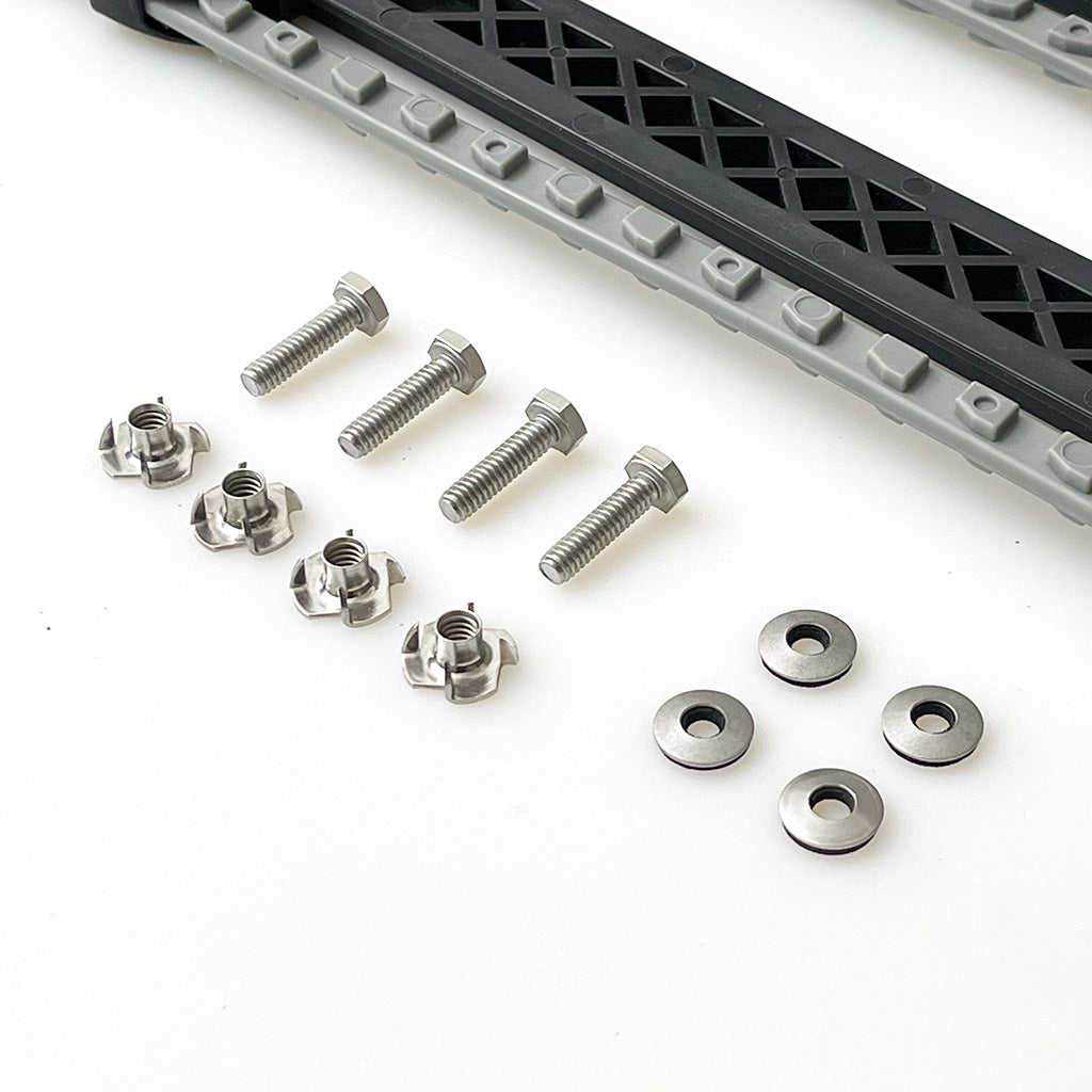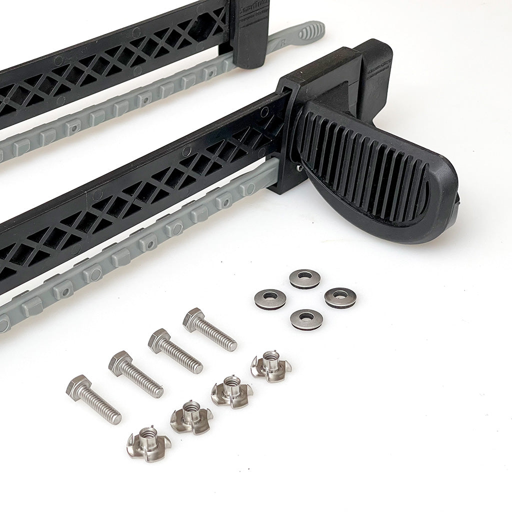 Includes the standard manufacturer hardware pack, and your choice of our two different skin-on-frame installation hardware options. We strongly prefer the T-nut and bolt install method, but these can be also be screwed to the gunwale if that works with your kayak.