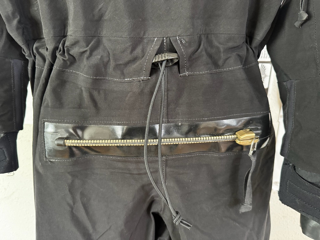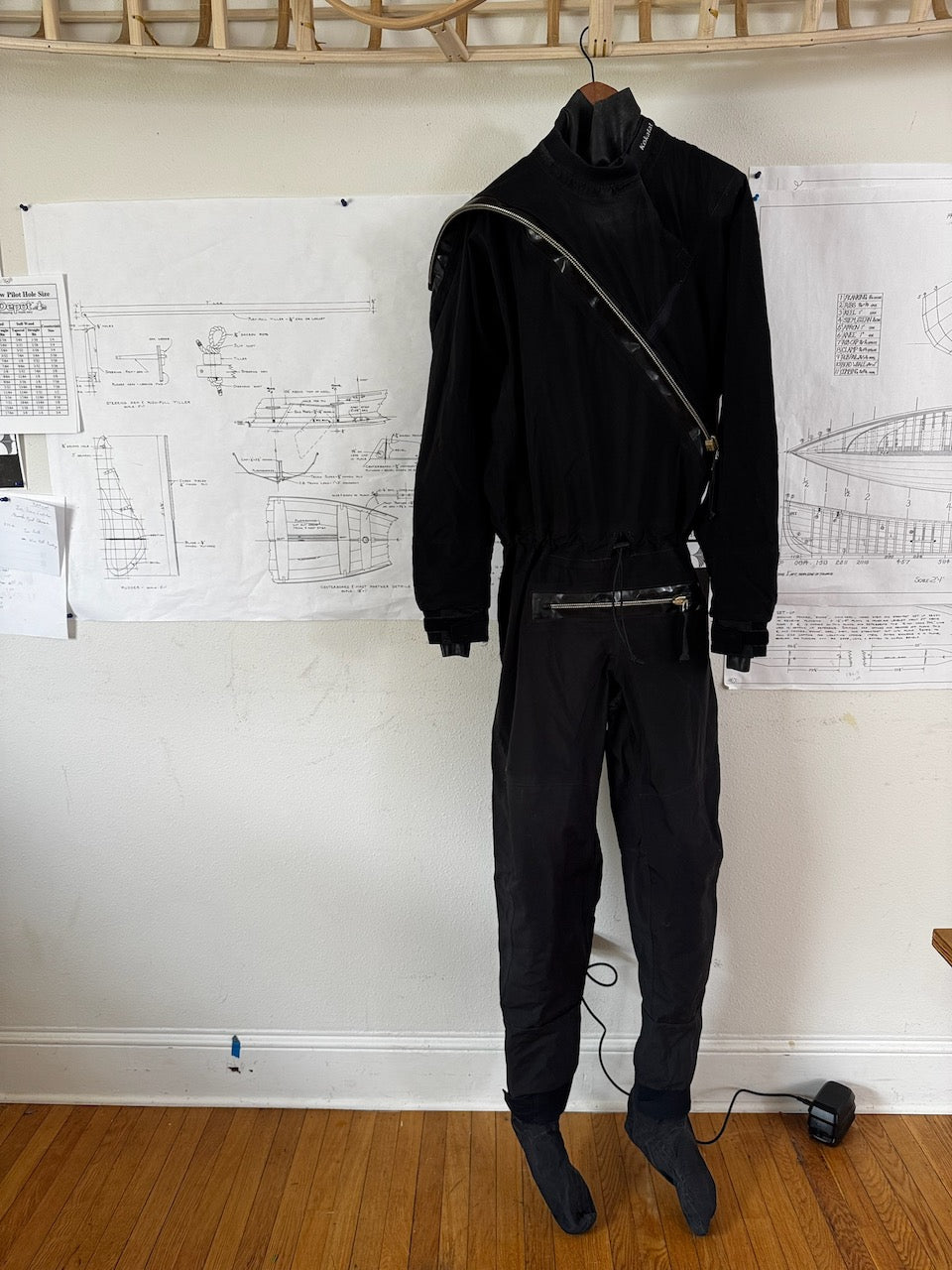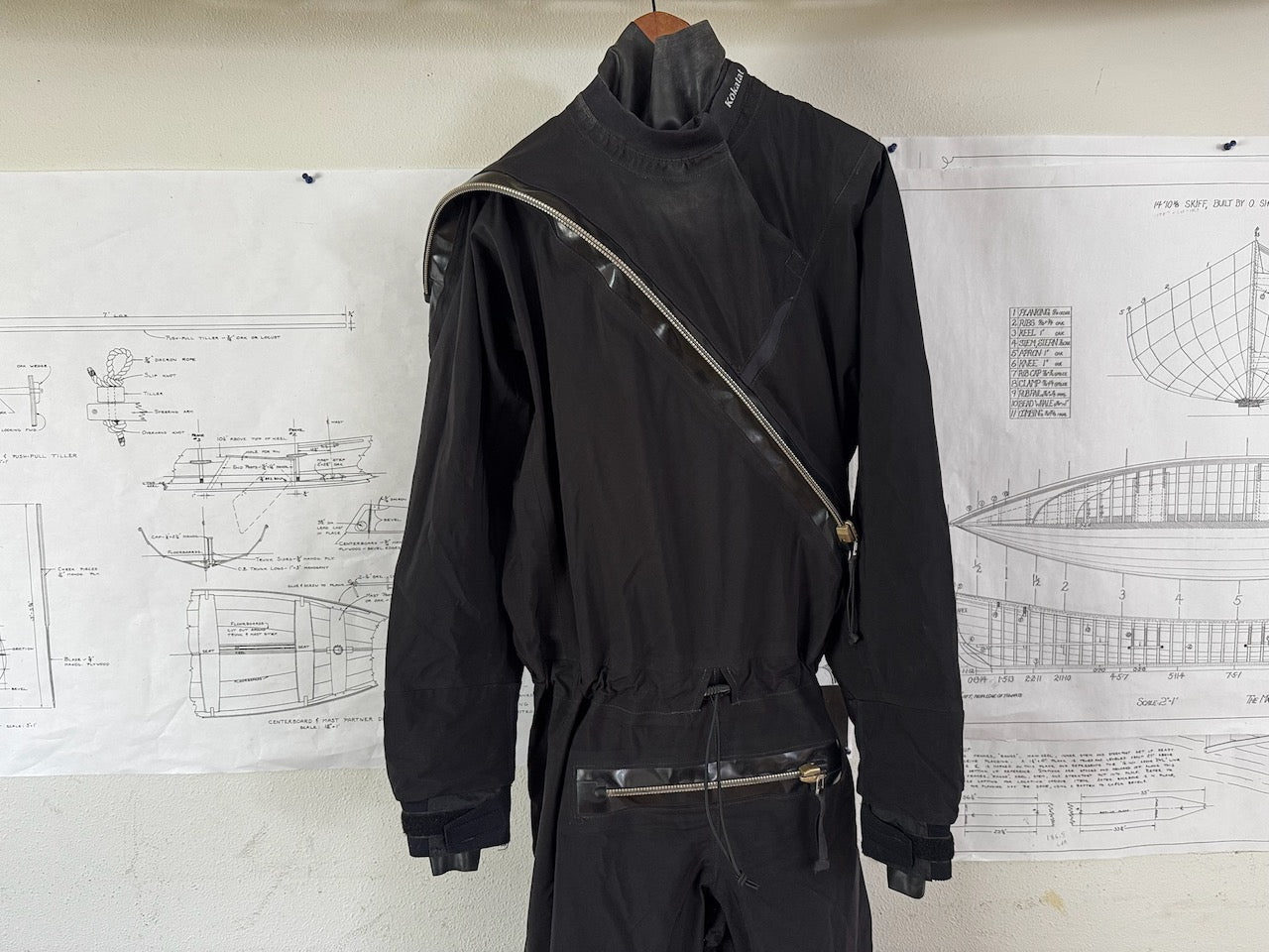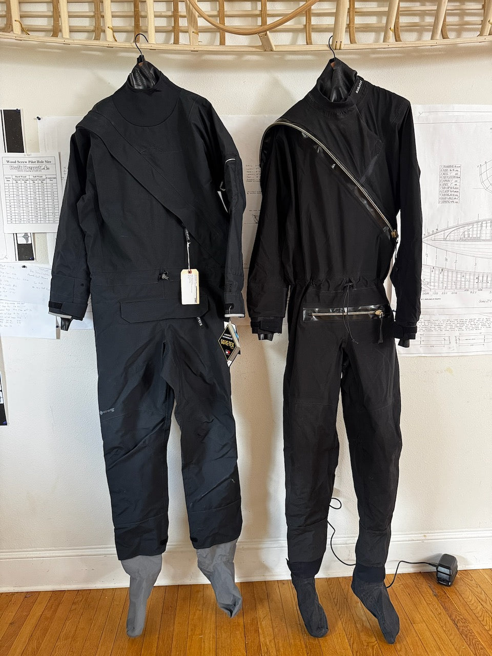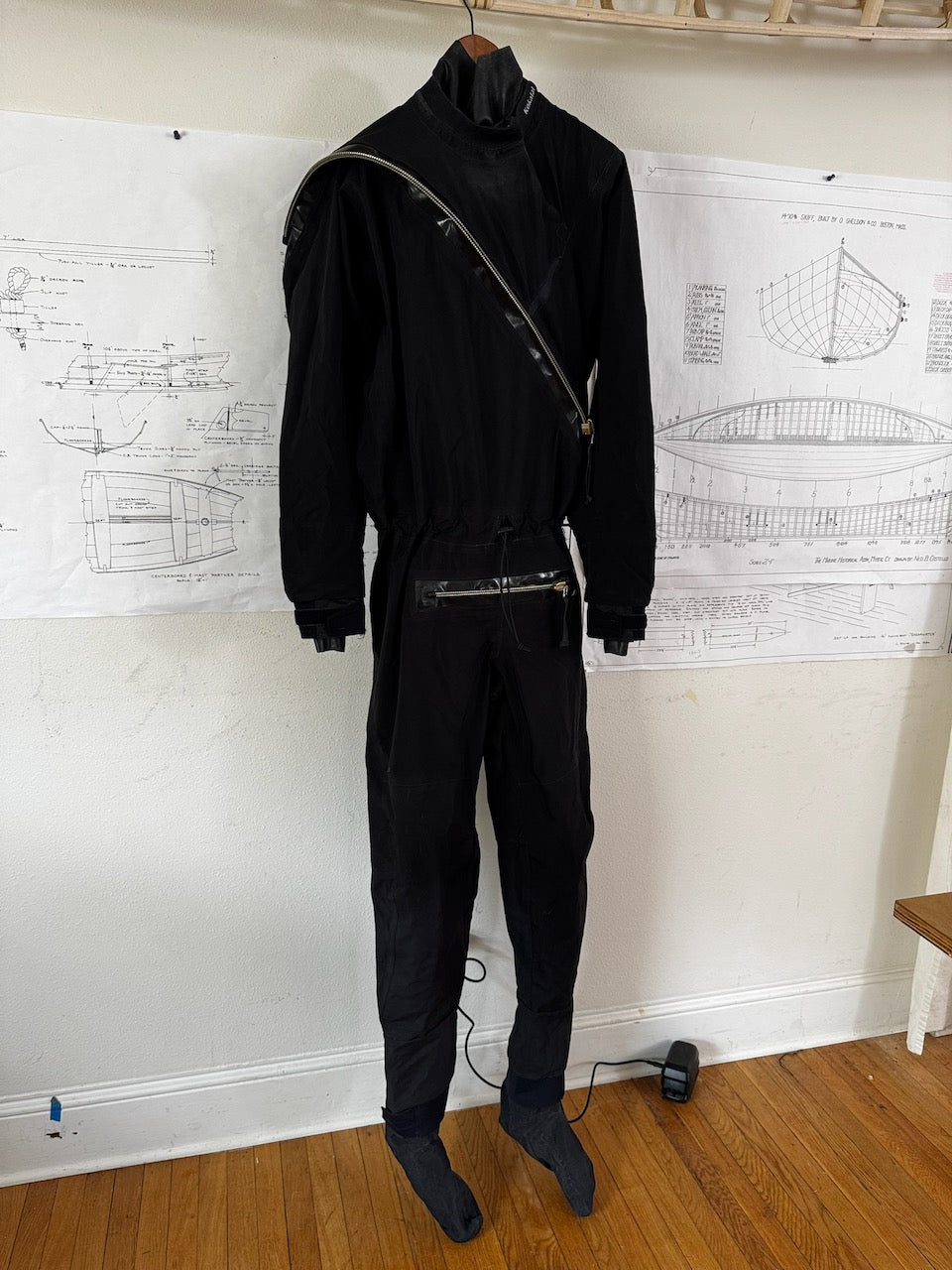 This is the older model of what is now the Legacy (which now costs $1450), and has a stainless steel scuba suit zipper as opposed to the newer plastic style. This is my personal dry suit that I have used a couple times a year for the last five years when testing new boats in cold water. It is in good condition with no leaks and all gaskets have been recently replaced. Kokatat has excellent customer service on their high-end dry suits.